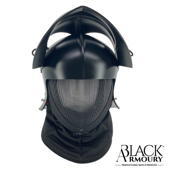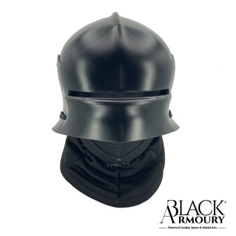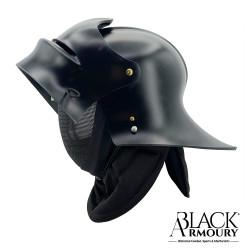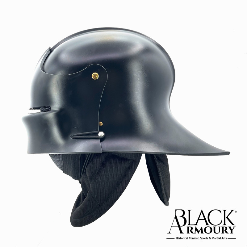 A fully integrated medieval sallet style HEMA helmet, with hinged visor.  A perfect compliment to our line of synthetic medieval armour*