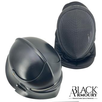 Modified HEMA mask with integrated hard shell overlay. This mask, due to the modifications, is NOT rated.  However, unofficially, the bib and face mesh are the same as used in our 350N fencing masks.